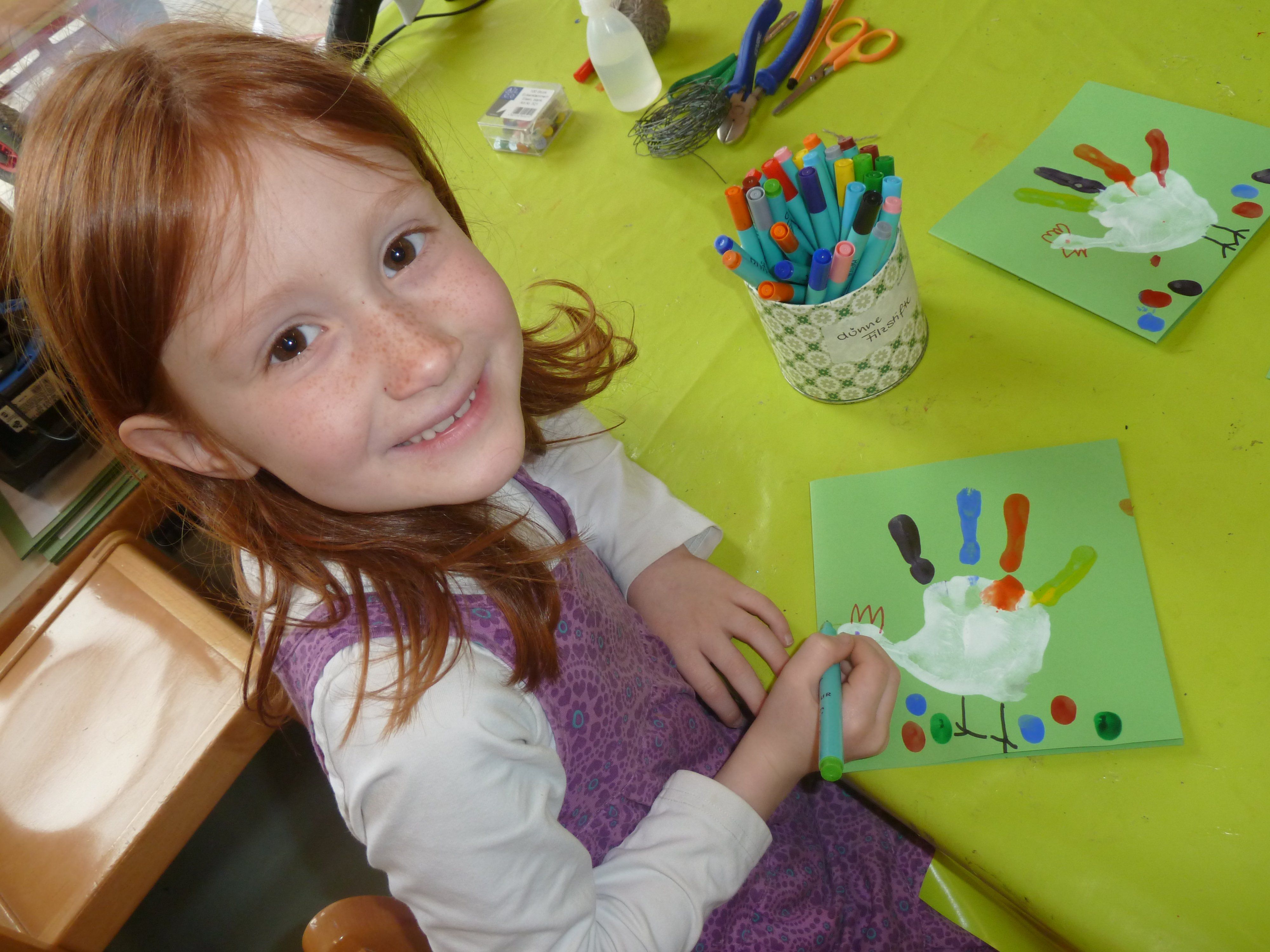 Martina lässt für ihre Osterkarte aus einem Handabdruck eine Henne entstehen.