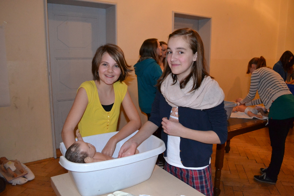 Stefanie (13) und Lisa (12) üben das Baden mit einer Puppe