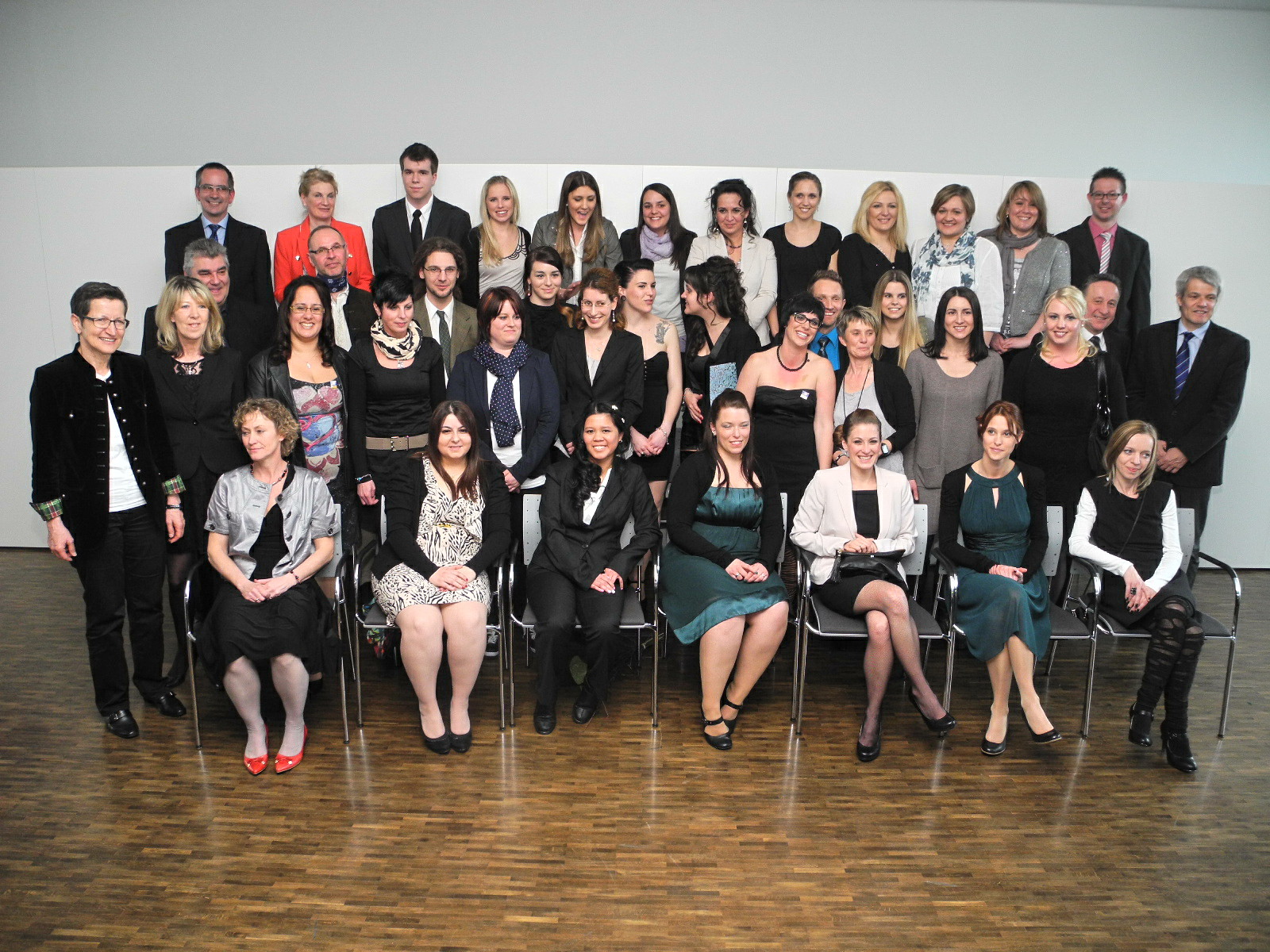 Überglückliche Absolventen mit dem Lehrerteam und den Ehrengästen