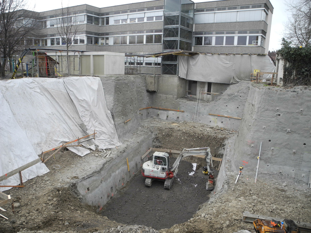 Die bis zu zehn Meter tiefe Baugrube für das Biomasseheizwerk Bifang in Rankweil bei der VS-Montfort.