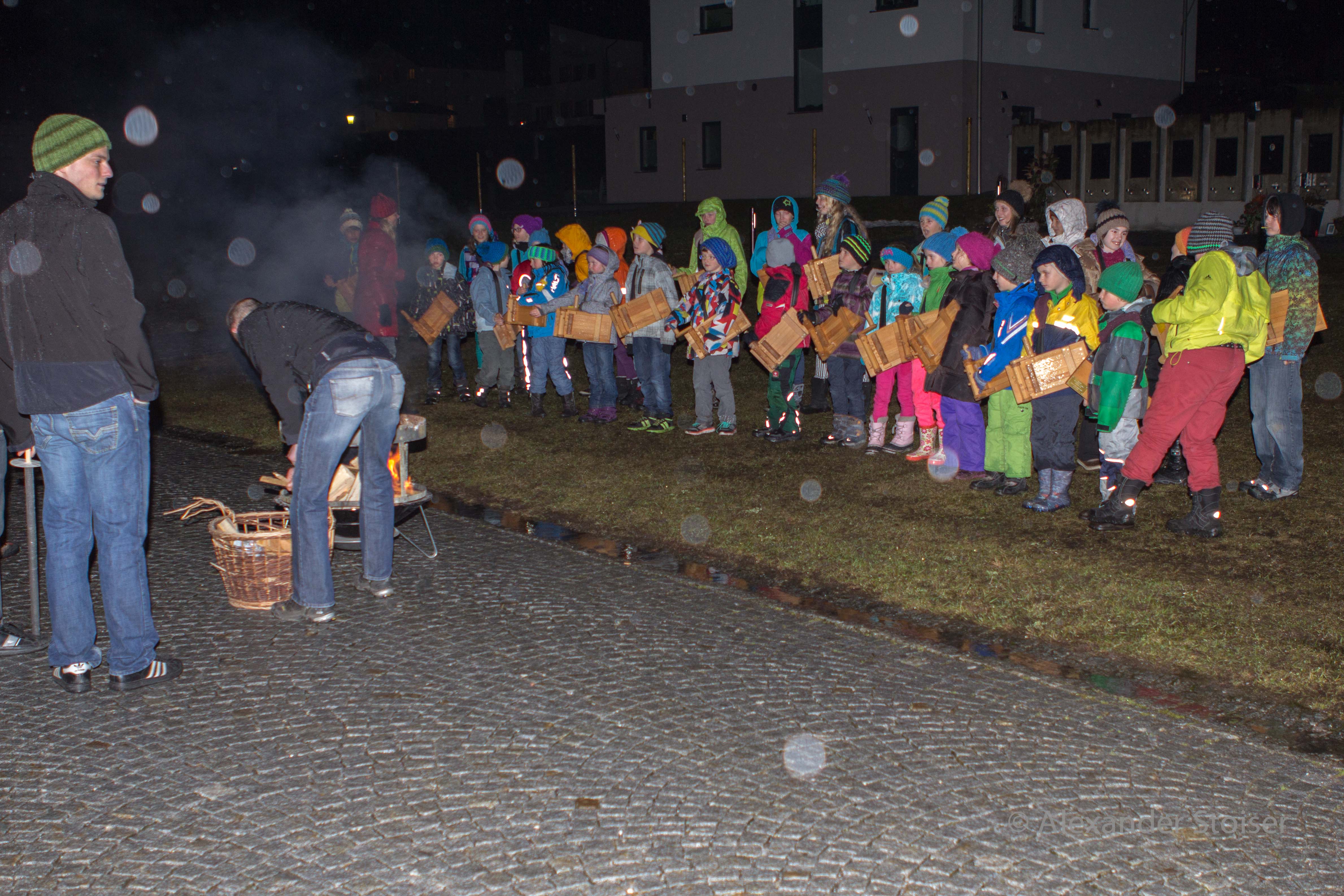 Rätschkinder stellen sich zum Messruf auf. Die Funkenzunft sorgt für ausreichend Licht.
