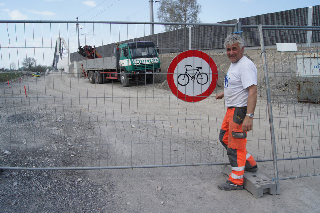 Auf der Südseite der Brücke nimmt der Radweg, der ins Rheinvorland führt, Formen an.