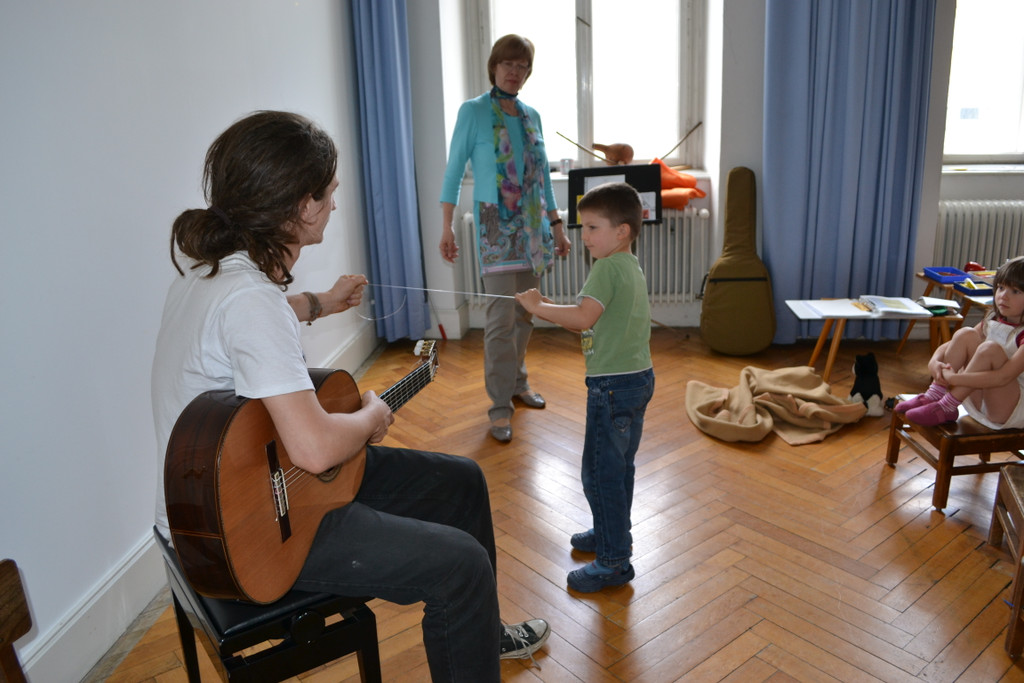 Michael (6) und Thomas versuchen, eine Saite zu spannen