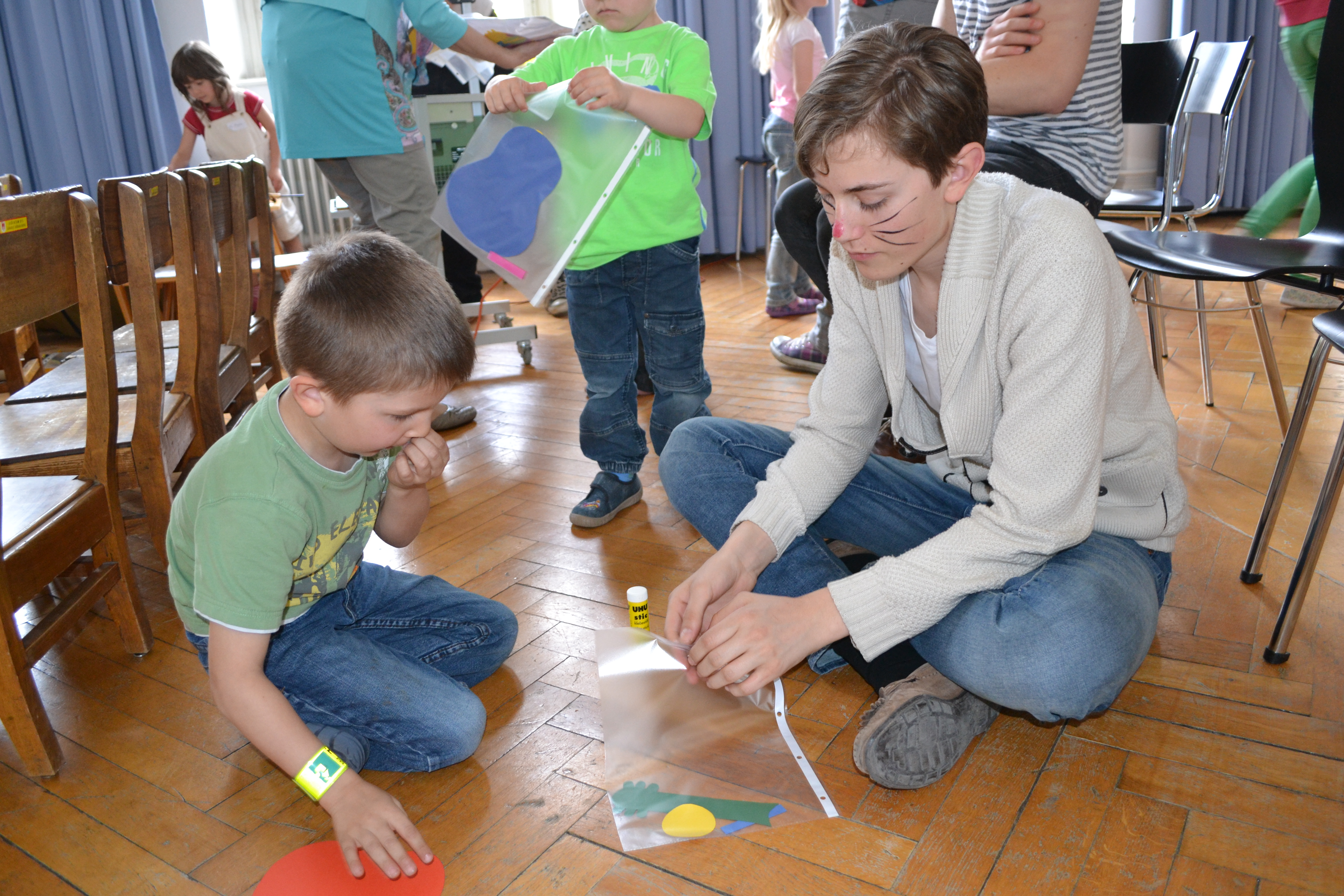 Michael (6) und Äneas beim Basteln einer Papiergitarre