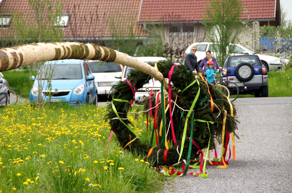 Mit Kränzen geschmückt und geschnitzt, wartet der Maibaum, gleich wird er aufgerichtet!