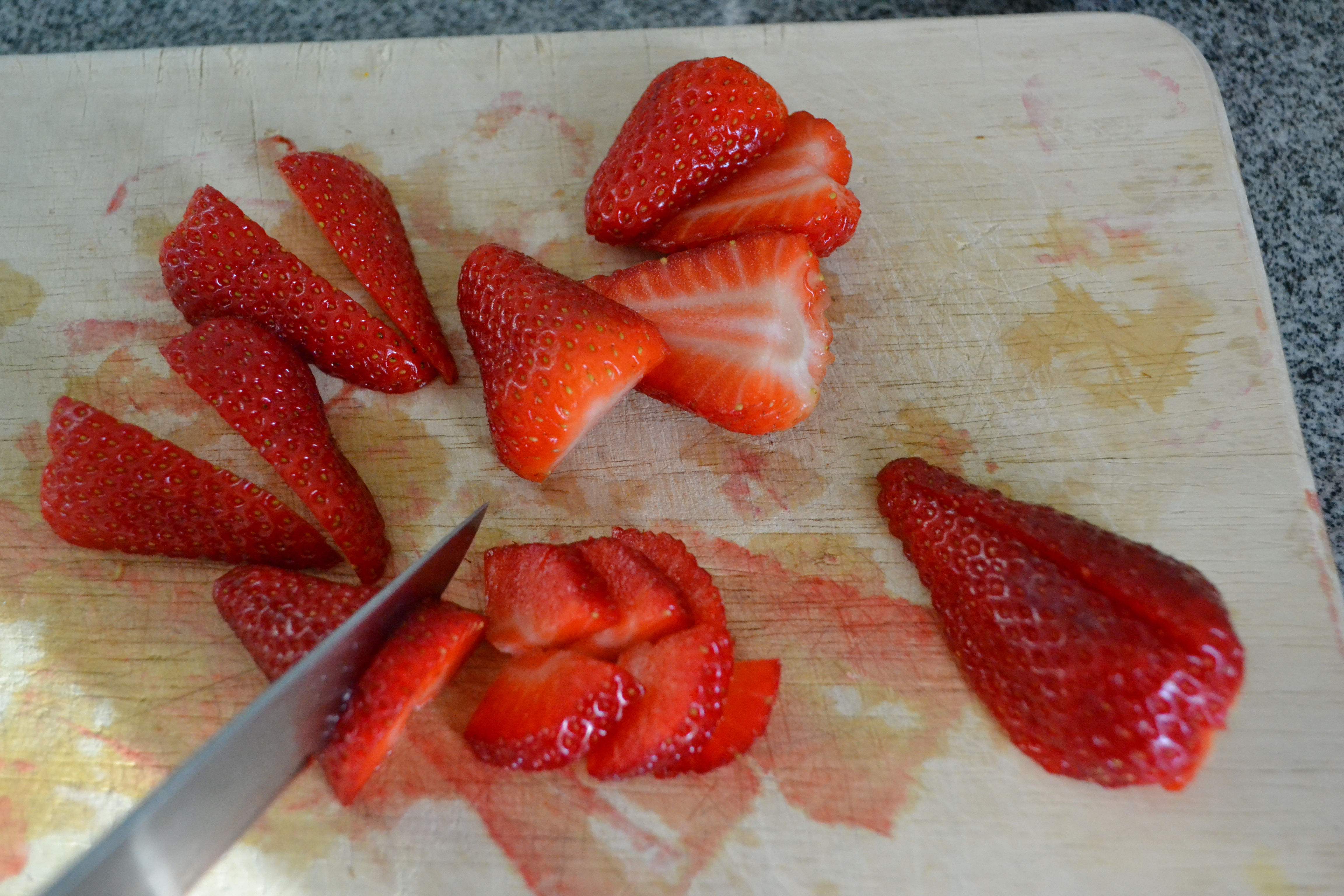Schneide die restlichen Erdbeeren in Scheiben