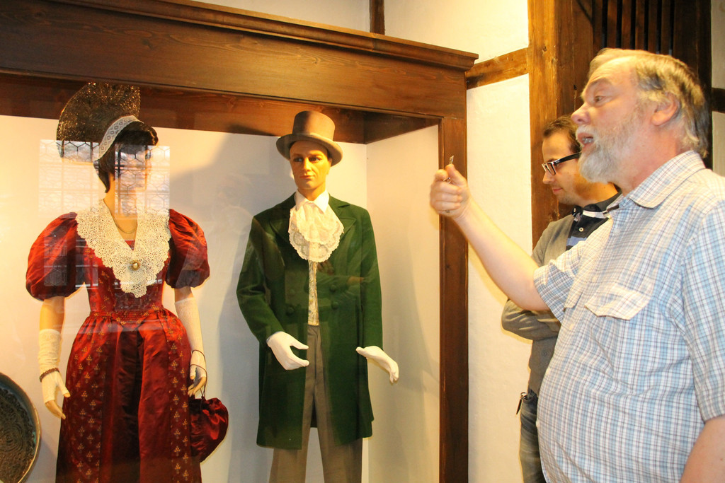 Beispiele Feldkircher Bürgertrachten in der Trachtenvitrine.