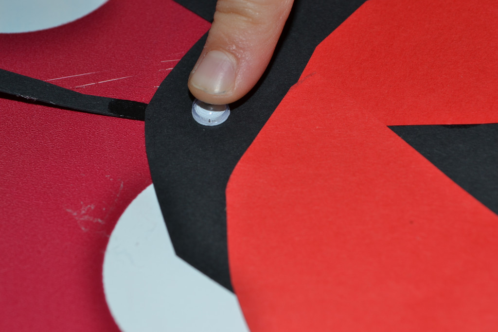 Klebe die Wackelaugen auf den Marienkäferkopf