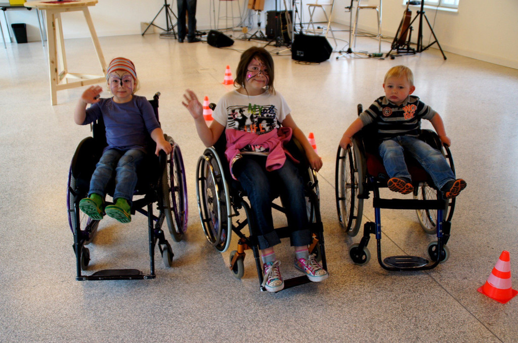 v.li. Olivia(4), Eileen (11) und Konstantin(2) "üben" Rollstuhl fahren!
