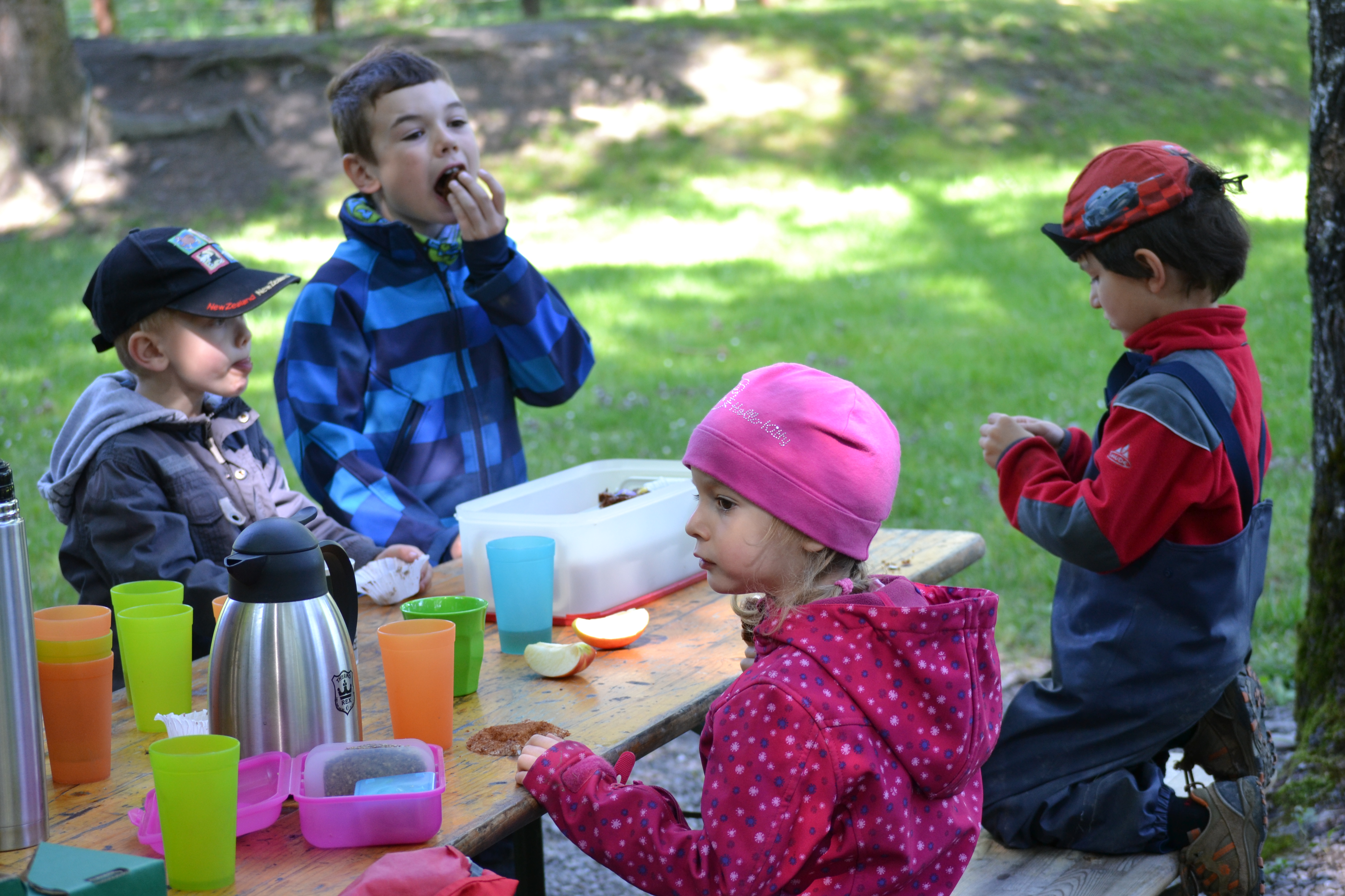 Philipp, Leo, Ramona und Emil lassen sich die Jause im Freien schmecken