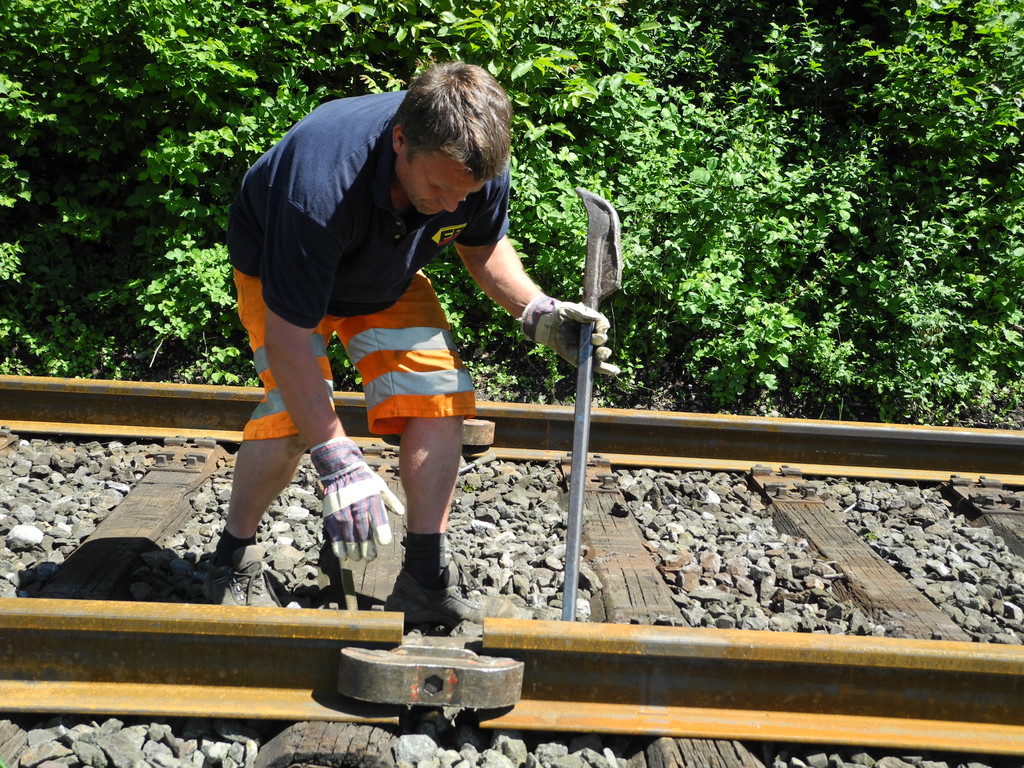Auch schwere Handarbeit ist notwendig wenn die bereit gelegten 120 Meter langen Schienen zusammen gezogen werden müssen