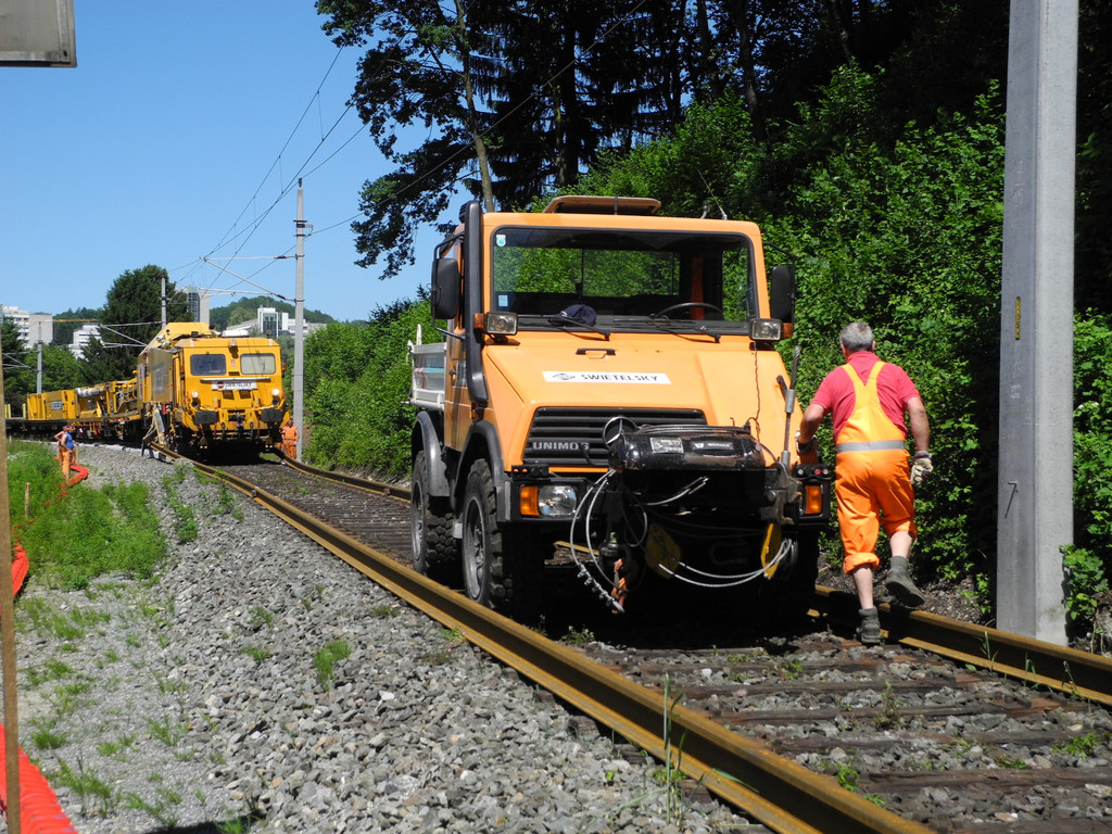 Schienenumbauzug in Aktion