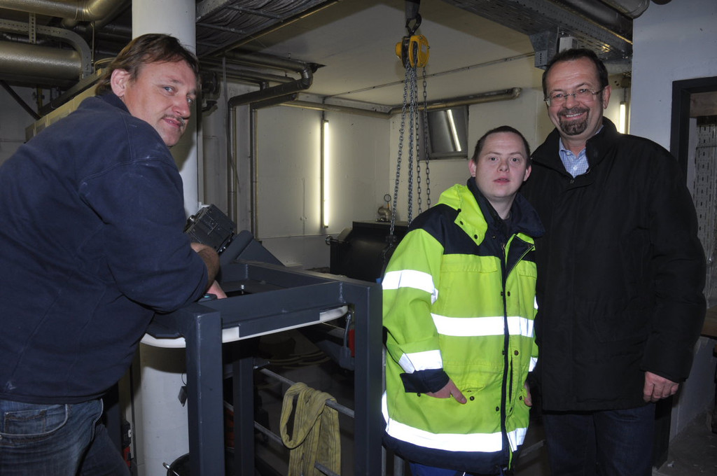 Gebäudewart Martin Stark und Bgm. Rainer Siegele mit Jürgen in der Heizzentrale.