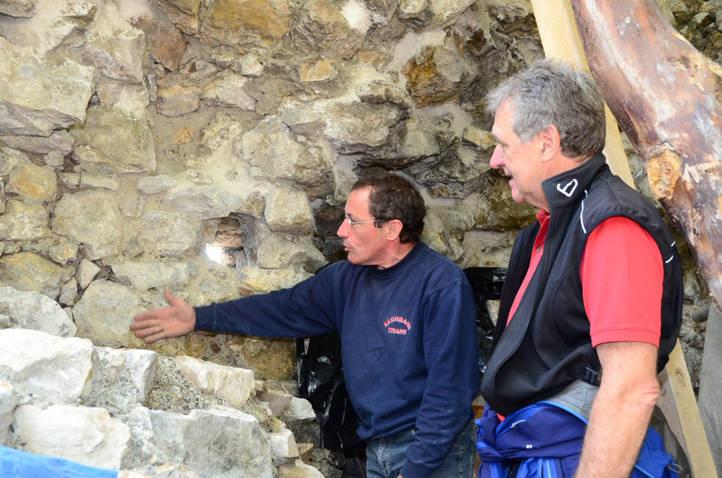 Durch zwei Schalen und verschiedene Mörtel wurde sichtbar, dass der Gefängnisturm in zwei Bauphasen entstand, erklären Otto Summer und Reinhard Sonderegger.