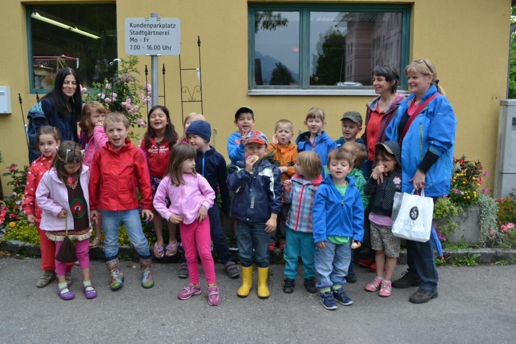 Die Pädagoginnen Mary Naphegyi, Anneliese Keckeis und Britta Roels mit den KIBE-Kindern vor der Stadtgärtnerei