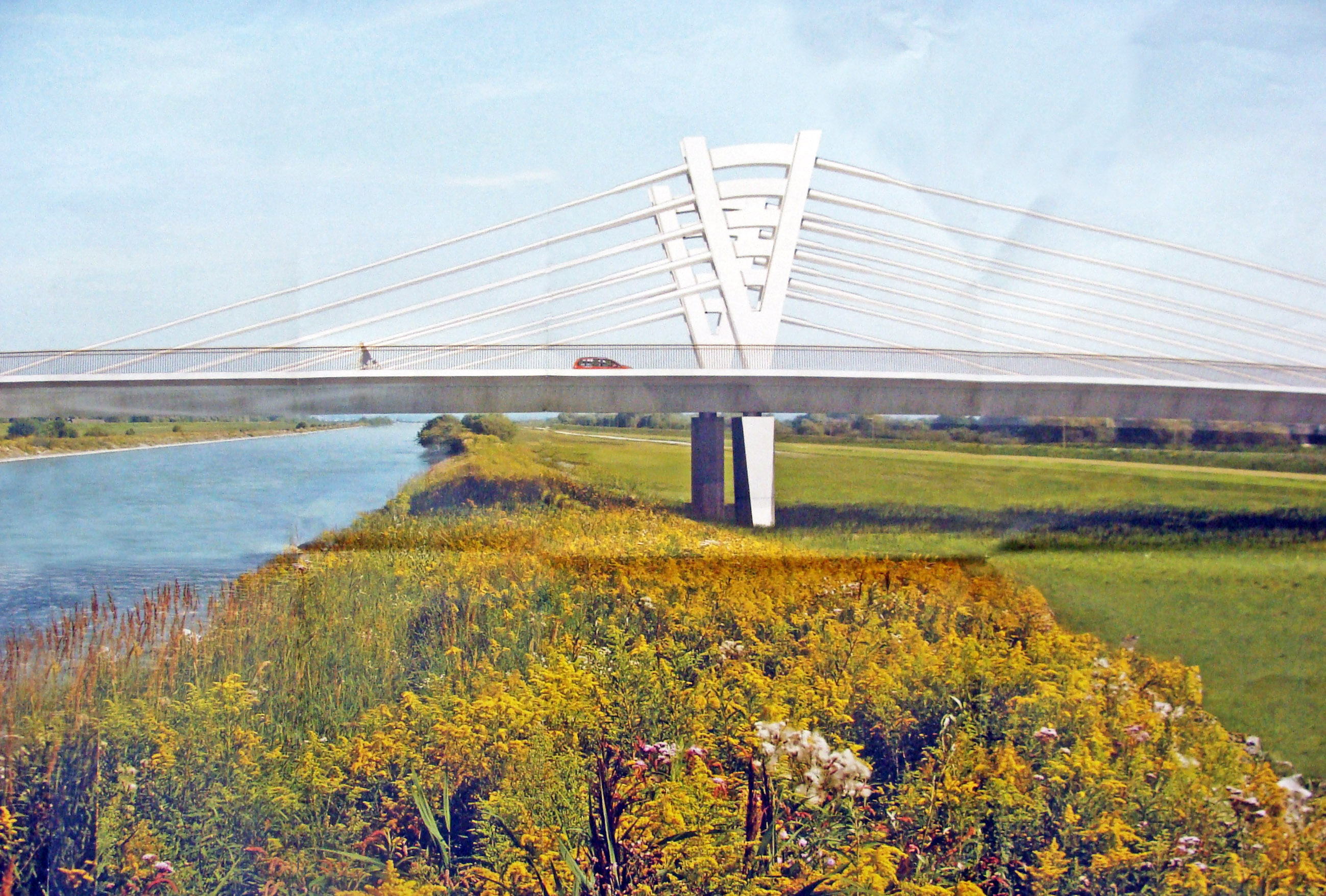 Die neue Rheinbrücke mit Pylonen und Spannseilen