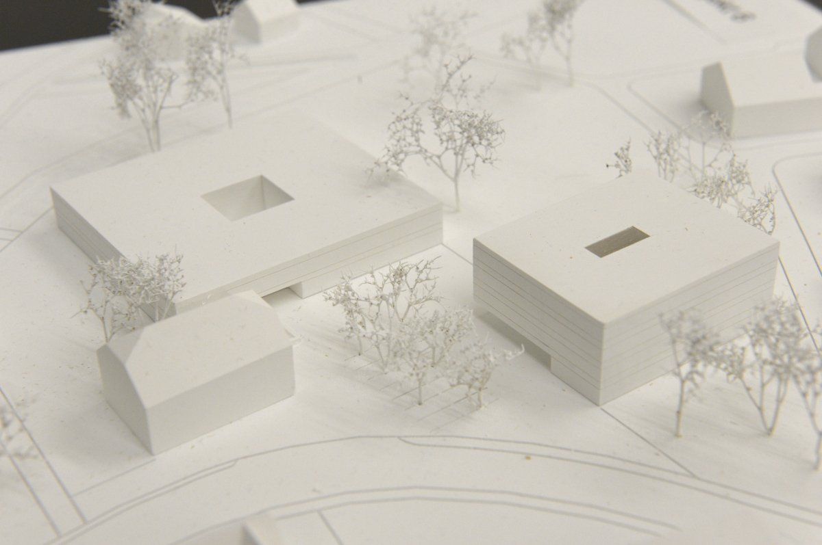 Die drei Baukörper: das dreigeschossige Versorgungsheim vorne, das zweigeschossige Pflegeheim und das viergeschossige Betreute Wohnen.