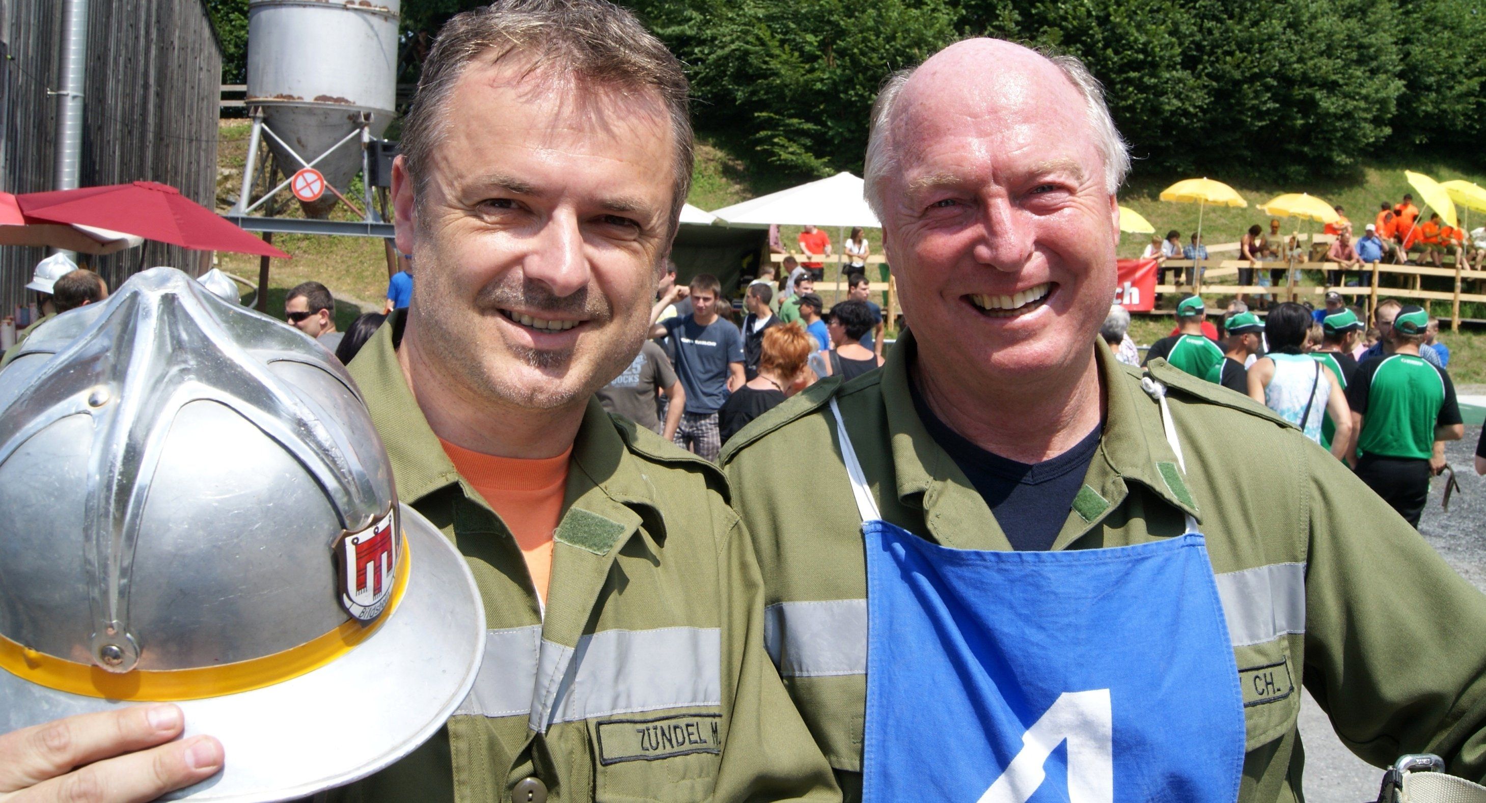 Bildsteins Bürge Troy (re.) und Gemeinderat Moosbrugger gingen beim „Sonderbewerb“ mit den Feuerwehren auch „Tuchfühlung“.