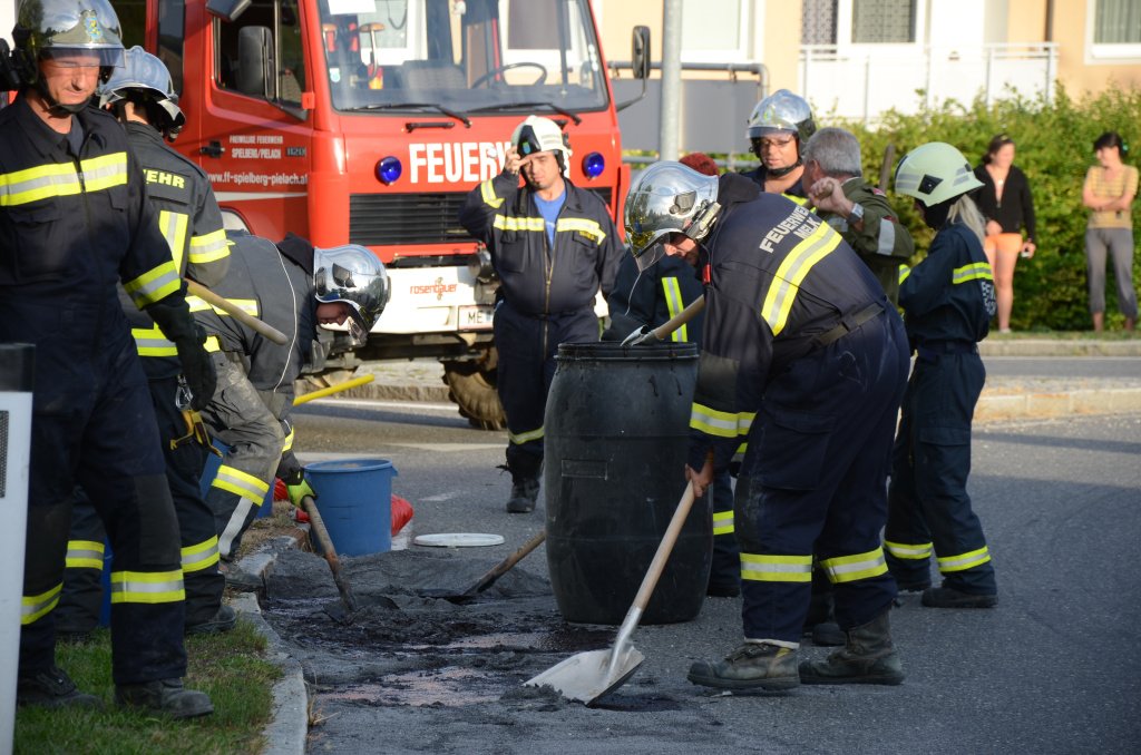 Bitumen bei Lkw-Unfall auf der B1 in Spielberg ausgetreten