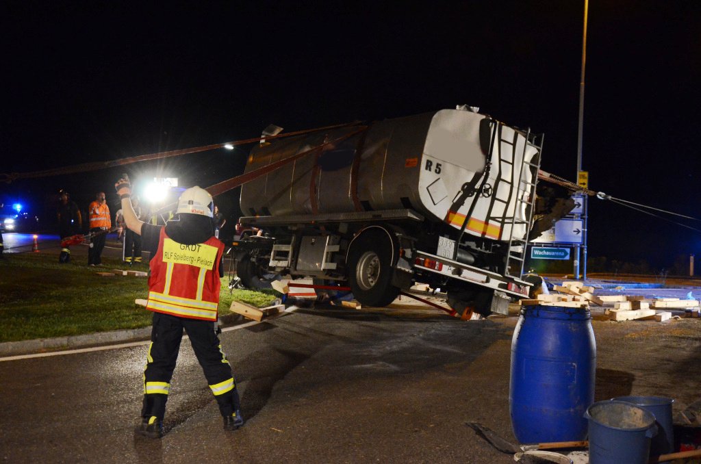 Bitumen bei Lkw-Unfall auf der B1 in Spielberg ausgetreten