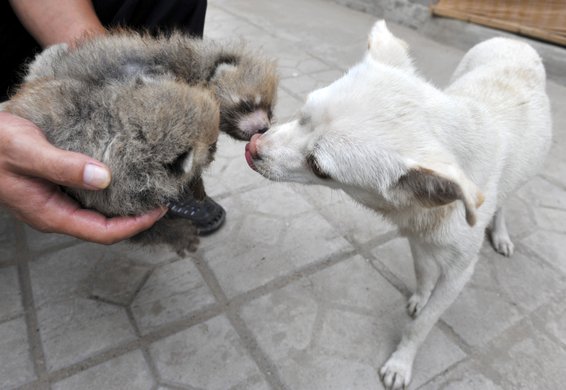 Hündin zieht in China Kleine Pandas groß