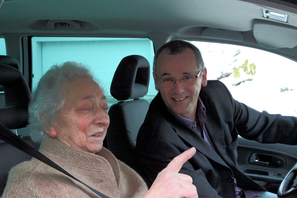 Einen besonderen Service konnte man im Wahlsprengel Fellengatter in Anspruch nehmen: AK-Vizepräsident Werner Gohm holte gehbehinderte WählerIinnen von zuhause ab, jier mit IOda Hartmann