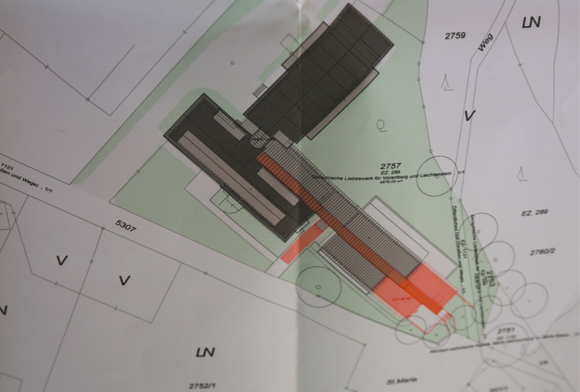 Der rot markierte Bereich ist der zweistöckige Neubau
