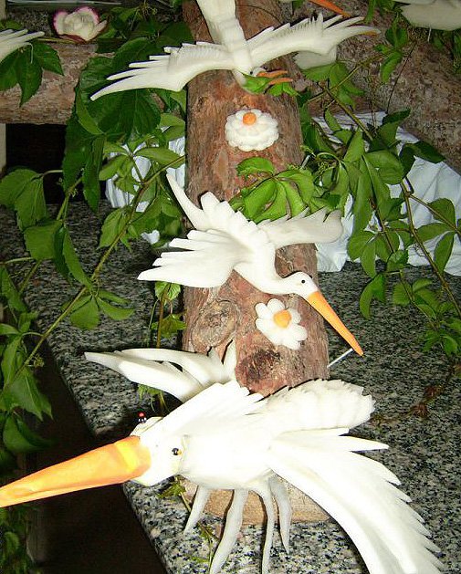 Rohkost-Vögelchen im Aska Hotel Washington Resort / Türkische Riviera: Was flattert denn da zwischen den Ästen? Es kann wohl nur der bekannte Rohkost-Vogel sein! Liebevoll und filigran haben die Schnitzkünstler des türkischen Hotels sich in der köstlichen Buffetdeko verewigt. Schade nur, dass dieses Kunstwerk nicht von Dauer ist.