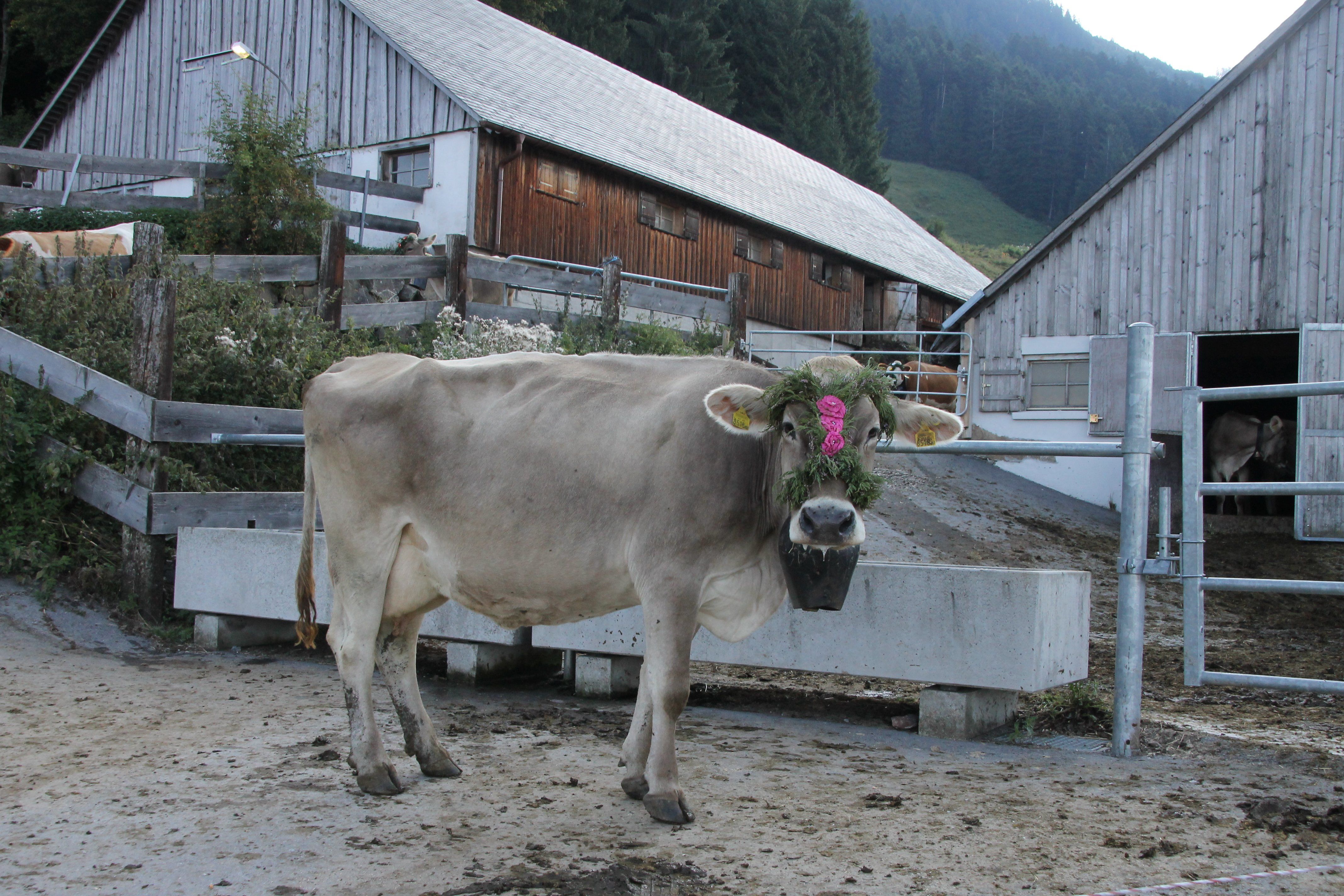 Zur Alpabfahrt geschmückte Kuh auf der Gulmalp.