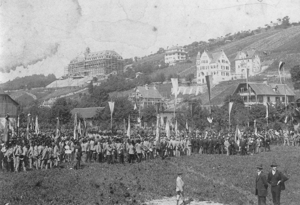 Schützenfest um die Jahrhundertwende. Im Hintergrund das im Bau befindliche Institut St. Josef und die heutige Dr. Hoffmann-Villa. Eingesendet von Rainer Masal.