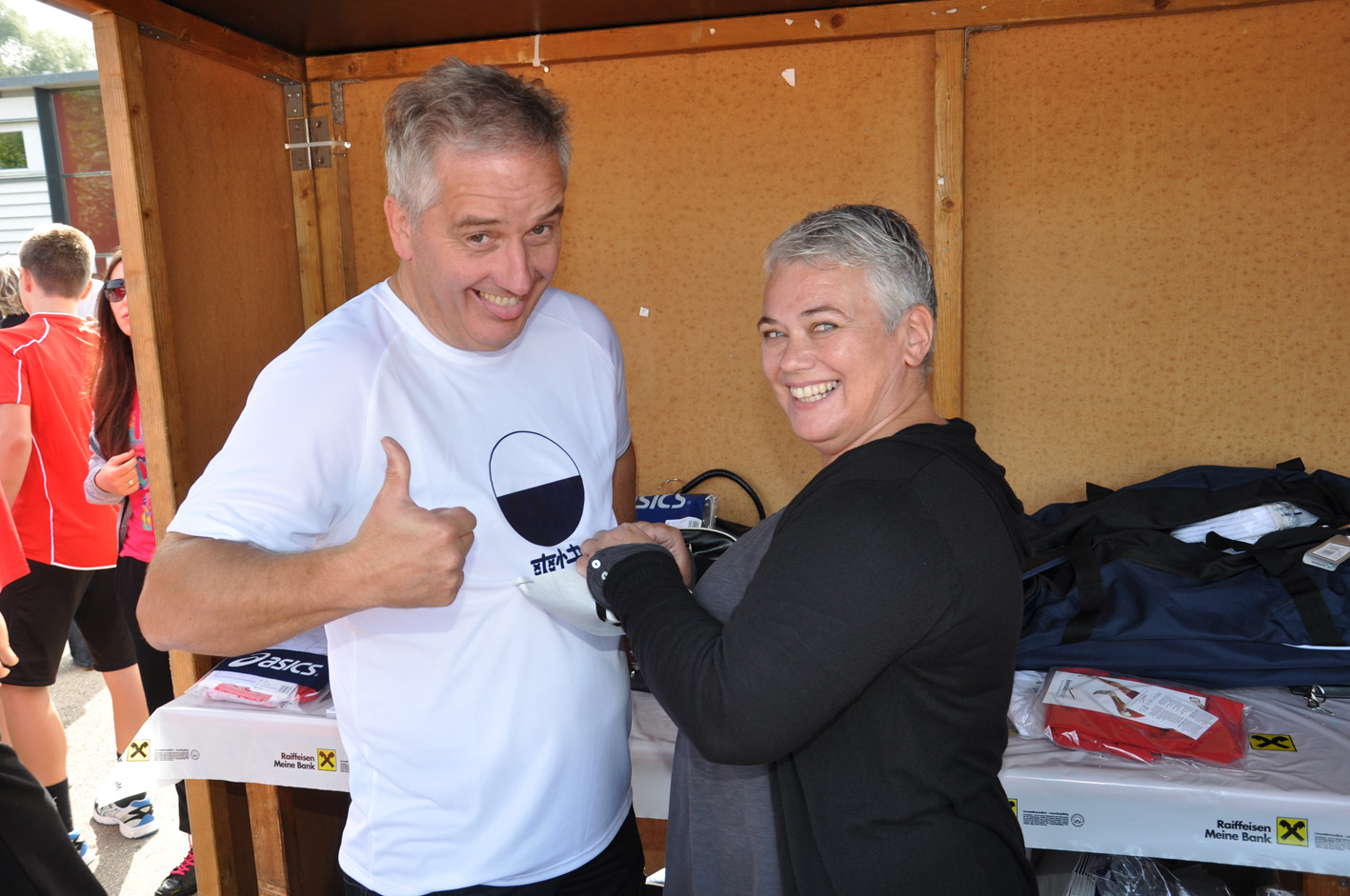 Reinhard Gasser lässt sich von Waldi Faigle die Startnummer befestigen.