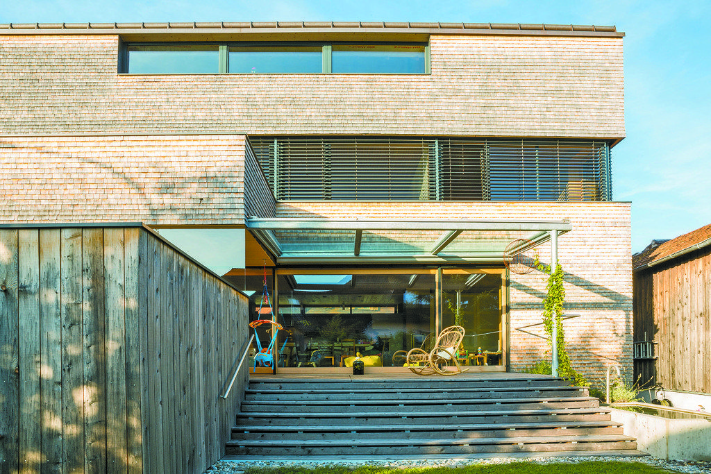 An der Westseite und geschützt von der Garage baut sich eine wohnliche Terrassenlandschaft auf. Schönes Vorfeld für die Wohnung im Erdgeschoß und darüber ein breiter Balkon, der den Eingang überdeckt.
