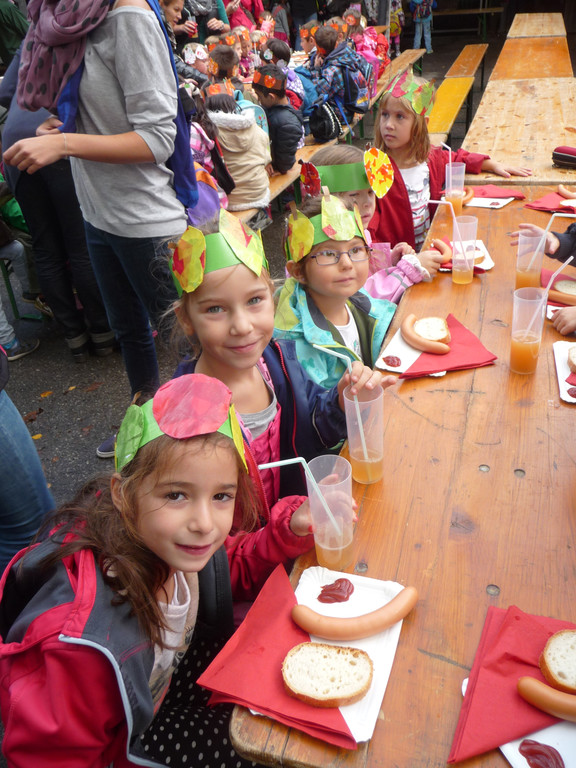 Die Kinder vom KG-Moos genießen den selbstgemachten Most und die feine Jause.