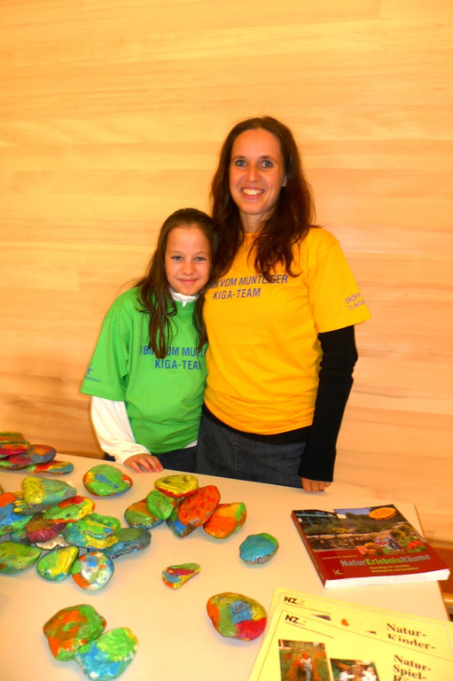 Anna und Kindergartenpädagogin Claudia Fröhlich beim Steineverkauf.