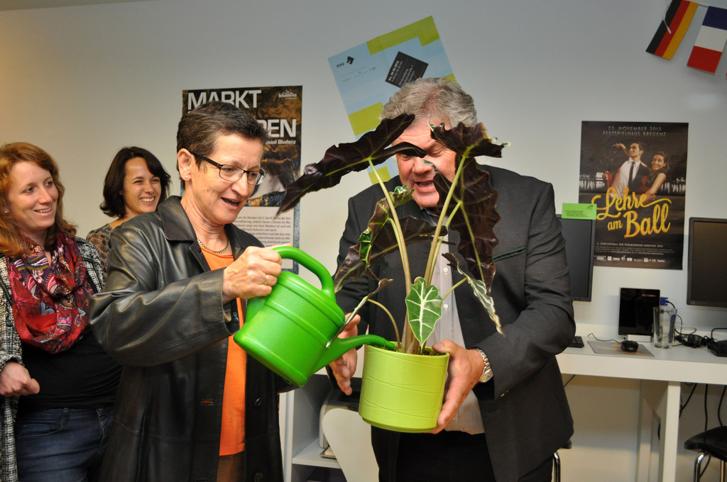 LR Greti Schmid und BM Mandi Katzenmayer mit Geschenk fürs Gemeinschaftsbüro.