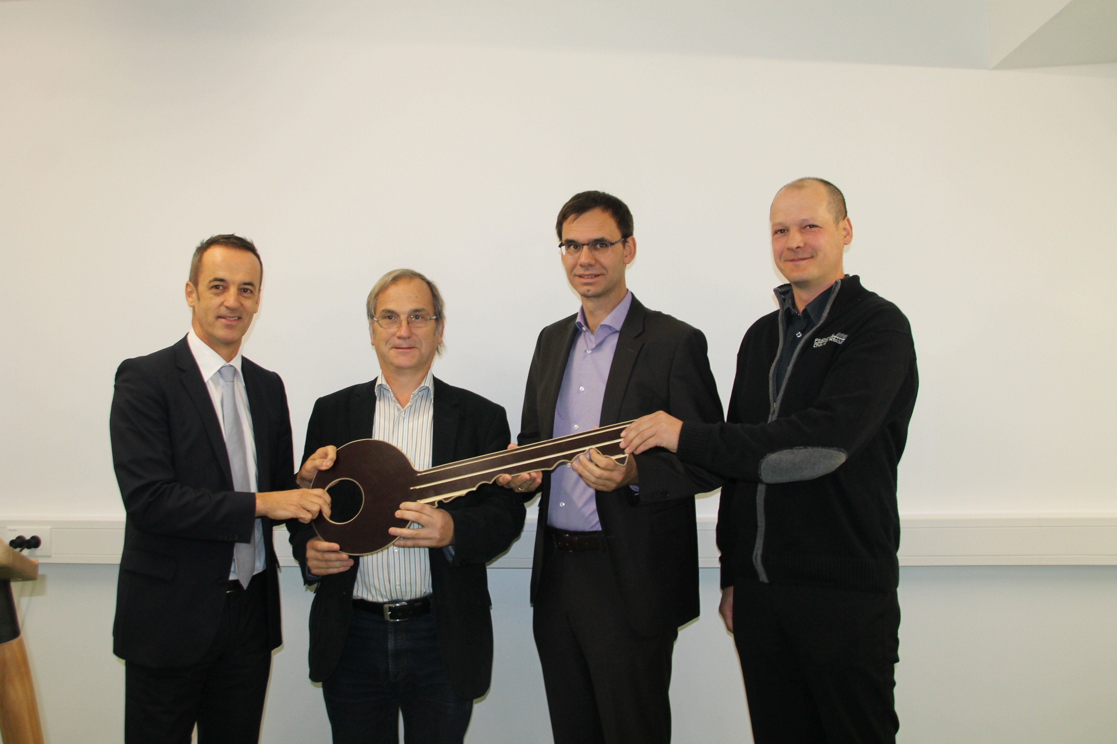 Dr. Hans-Peter Lorenz, Geschäftsführer VOGEWOSI, Bürgermeister Eugen Gabriel und Landeshauptmann Markus Wallner bei der symbolischen Schlüsselübergabe an Robert Mlakar, Bereichsleiter Wohnen – Leben bei aqua mühle Frastanz.