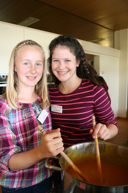 Jana und Lena beim Zubereiten einer Kürbiscremesuppe.