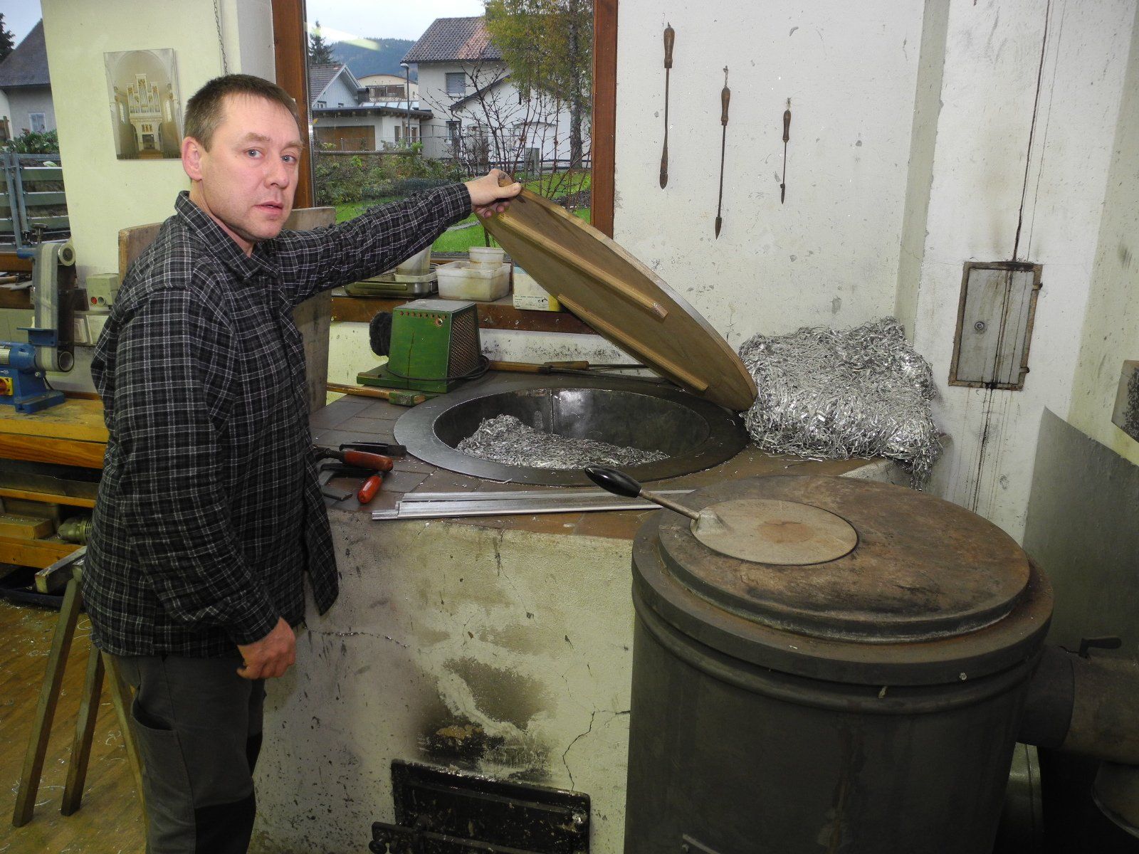 Bernhard Pflüger zeigt den Schmelzofen für das Zinn