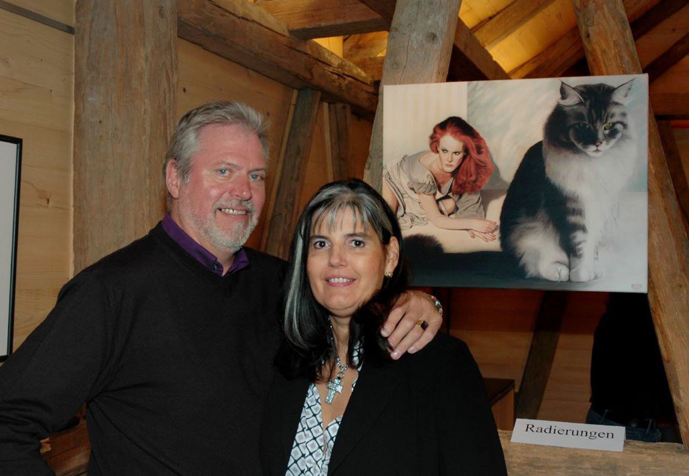 Günter Gruber mit Muse und Lebensgefährtin Anita vor einem Auftragswerk.