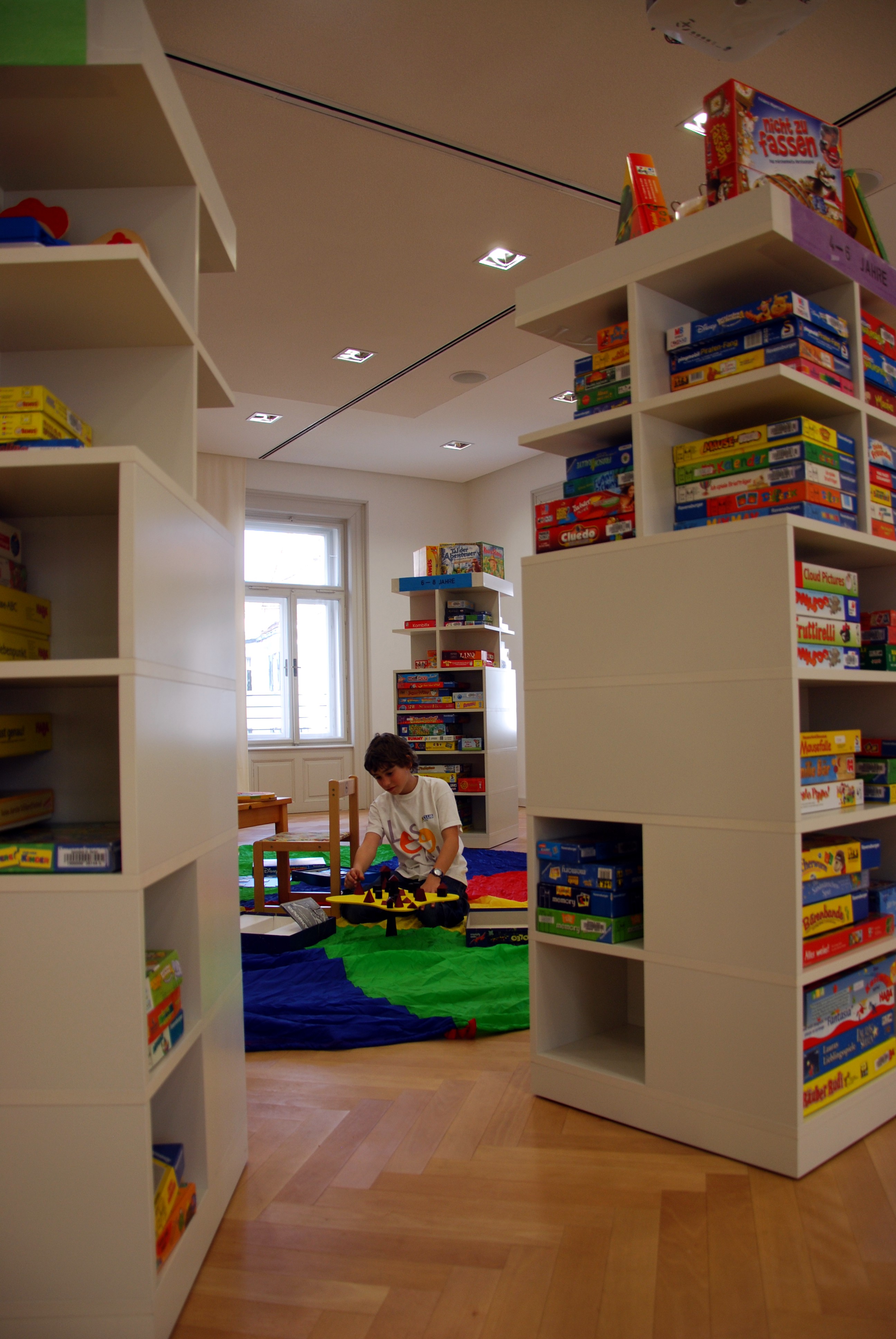 Die rund 1000 Spiele sind auf Regaltürmen nach Altergruppen geordnet.
