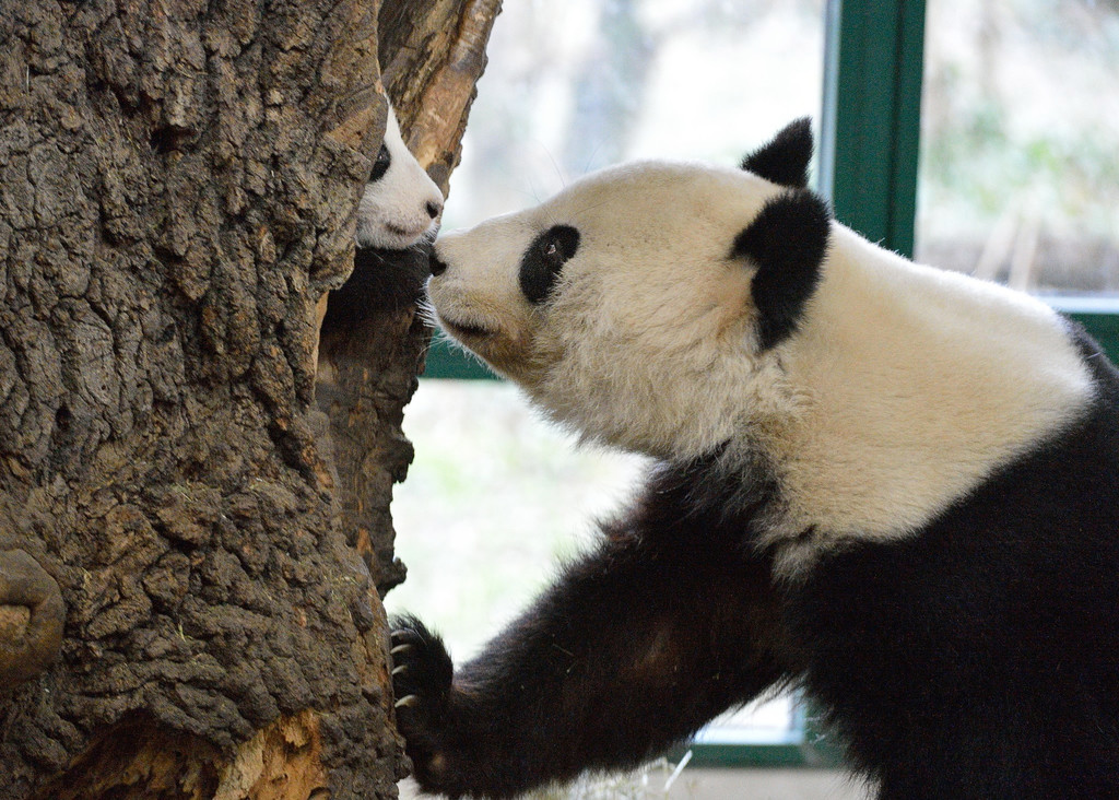 Panda-Bub Fu Bao schaut neugierig aus seiner Baumhöhle