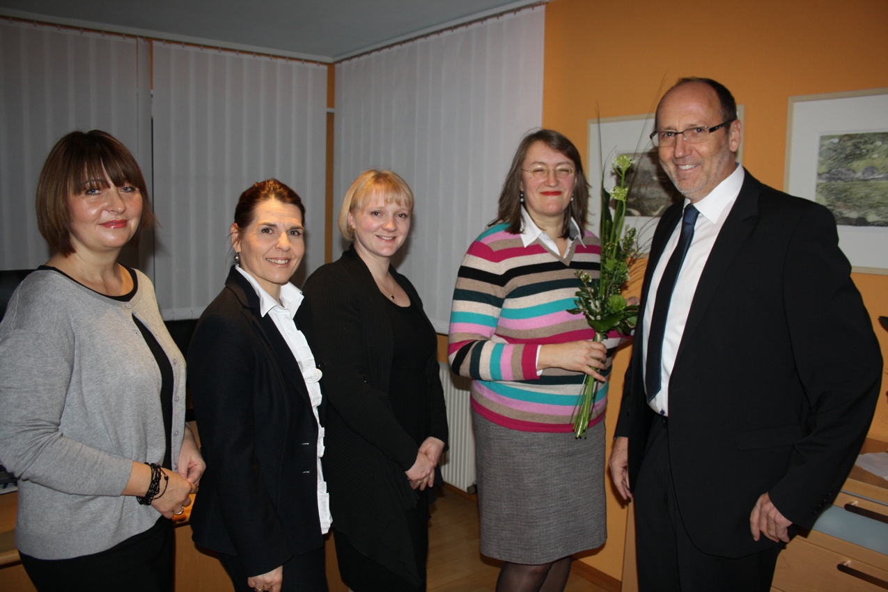 Bürgermeister Xaver Sinz begrüßt die neue Ärztin Dr. Sylvia Stuckenberg und ihr Team mit Angelika Stefani, Manuela Wackerle und Yvonne Natter hier in Lochau.
