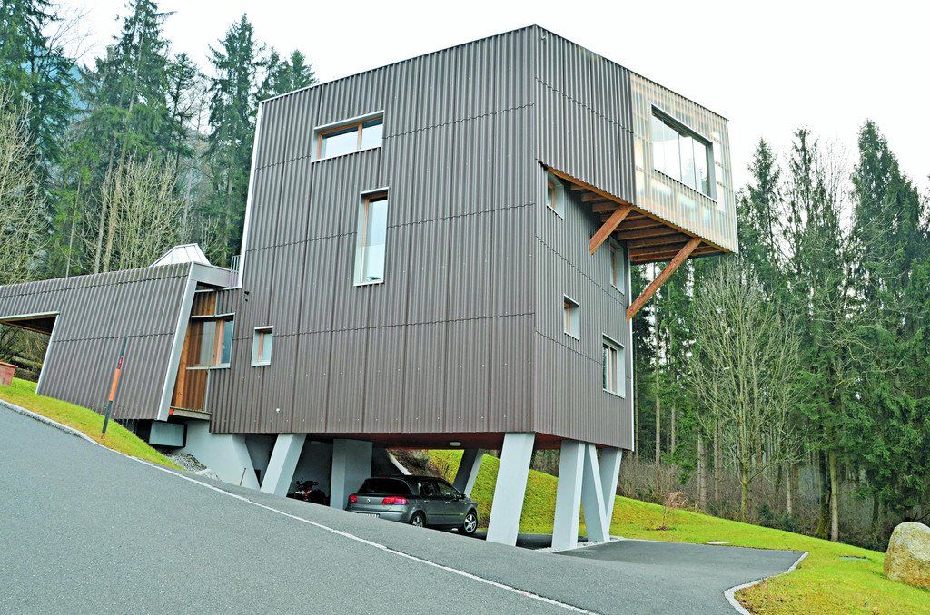 Ein steil aufragendes Faltenwerk inszeniert sich alpin, spricht eine laute, für manche recht kräftige Formensprache. Schräg gestellte, breite Stützen formen etwas wie ein Tier, vielleicht ein trojanisches Pferd, und bilden doch mit Augenzwinkern nur einen schützenden Unterstand für die Fahrzeuge.