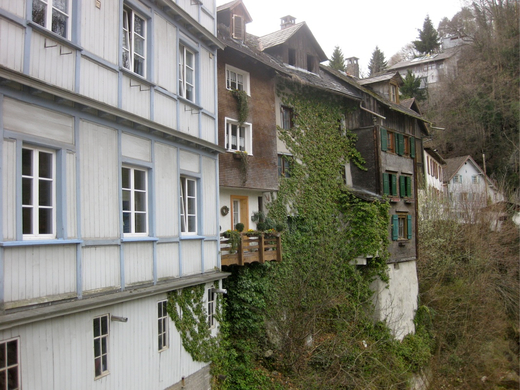 Von der Kapfschlucht aus hat man einen besonders beeindruckenden Blick auf die teilweise in den Felsen der Illschlucht gebauten Häuser