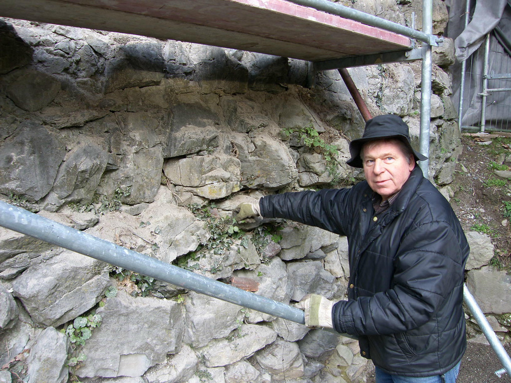 "Burgherr" Markus Kevenhörster zeigt die Schäden am Mauerwerk der Ruine