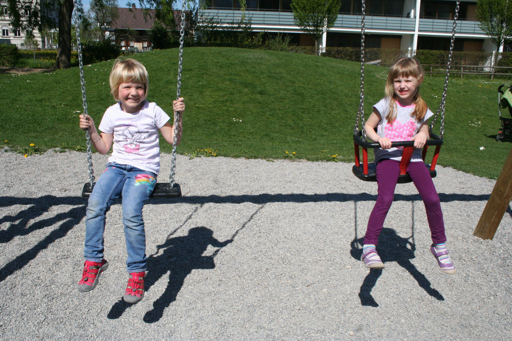 Spielplatz hinter dem Haus Gisingen im Dorfzentrum: Zoey und Wanda-Lorene.