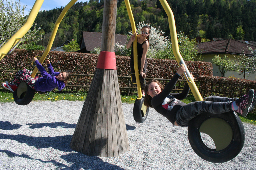 Spielplatz hinter dem Haus Gisingen im Dorfzentrum: Amy, Nina und Alin.