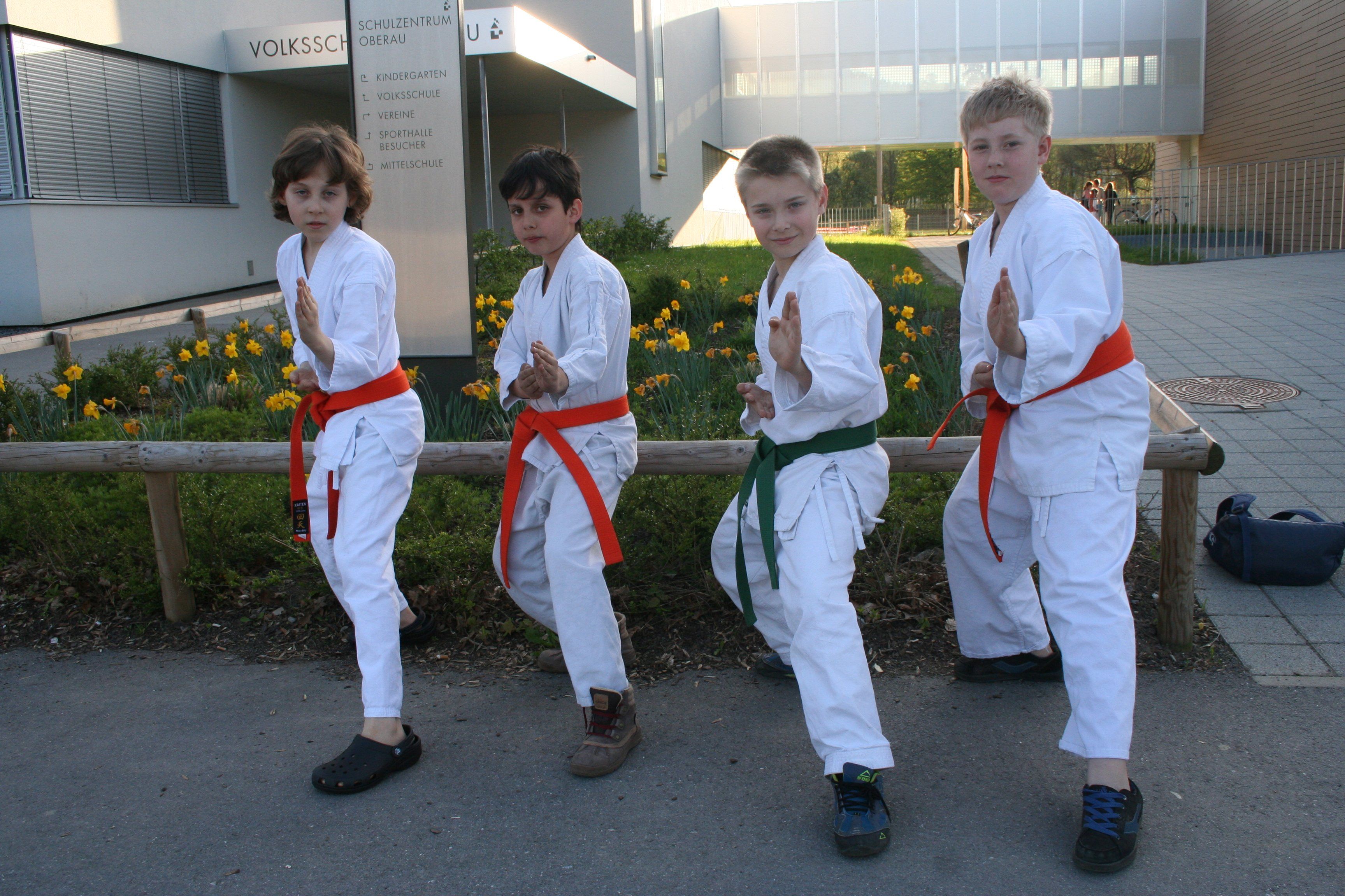 Elias, Haktan, Niklas und Steven vom Karateclub Gisingen vor ihrem Training in der Turnhalle im Schulzentrum Oberau.