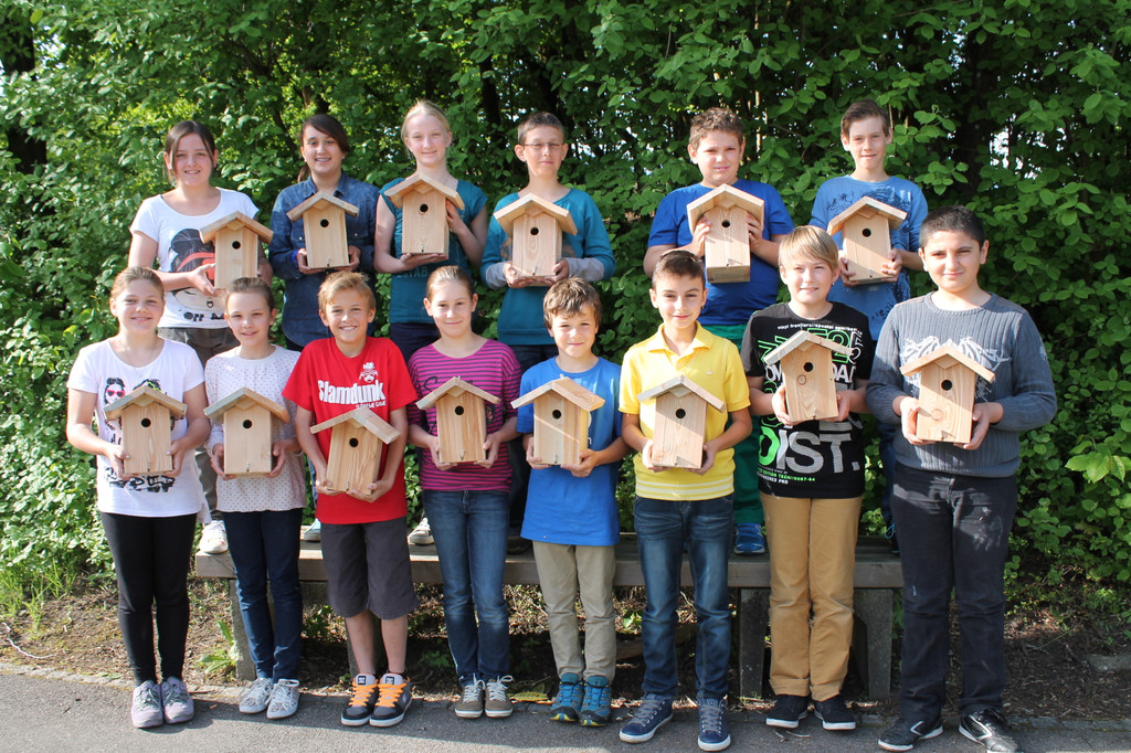 Schülerinnen und Schüler der 1a mit den Nistkästen.