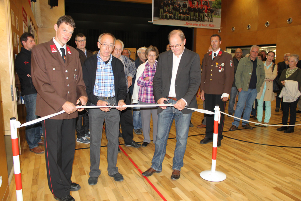 Eröffnungsband wird durchschnitten von Gremiumsleiter Thomas Porod, Historiker und VS-Dir. i.R. Werner Nachbaur sowie Bgm. Reinhard Nachbaur. Rechts dahinter Kdt. Christian Devigili.